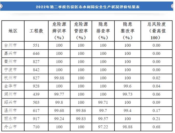 根據《水利部辦公廳關于印發2022年第二季度流域管理機構和省級區域水利安全生產狀況評價結果的通知》(辦監督函〔2022〕65號),我省第二季度水利安全生產狀況在全國排名第二,總風險度較低,繼續走在全國前列。為加強全省水利安全生產監管責任落實,促進水利安全生產形勢持續穩定,現對2022年第二季度各設區市水利局安全生產狀況評價結果予以公布。 ...